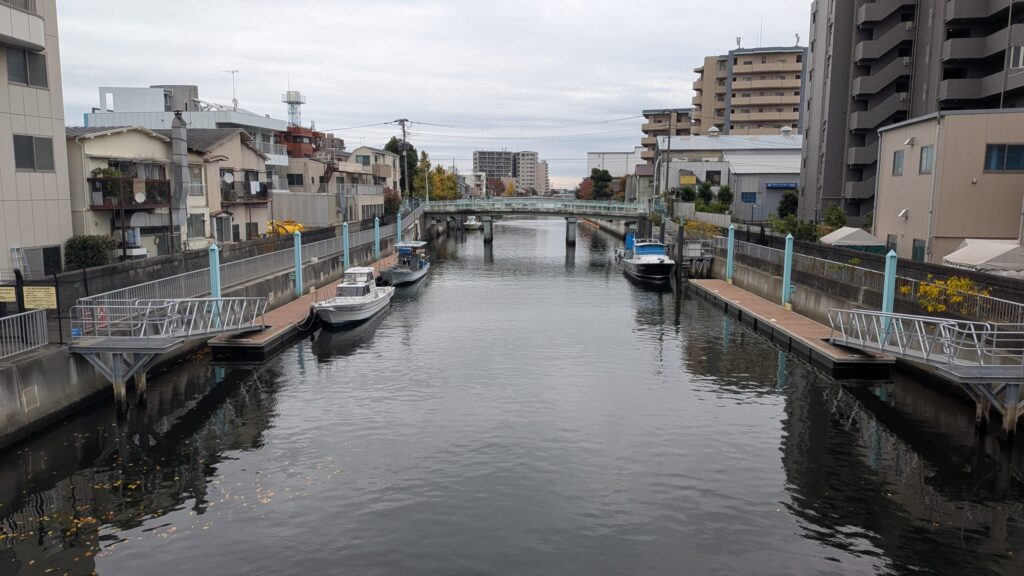 蒲田駅から下流はほぼ流れはなく、小型船舶の係留地となっています。桟橋の景観に伴う現象だと思うのですが、沿道が少なくなり、ランナーにとっては川の景色を眺めながらの走りが難しくなります。